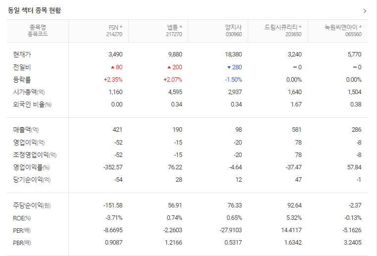 FSN 현재 주가는 3,410원이며 전일 대비 -50원의 모습을 보이고 있습니다. FSN의 주주현황을 살펴보면 제이투비(외 19인)이 지분 36.03%를 소유하고 있습니다. FSN는 미디어 기업으로 장중 기준으로 주가는 3,410원 입니다. 삼성전자의 시가 총액은 1132억 원이며 발행 주식수는 0.00주 입니다. 외국인 보유 비중은 954,955% 이며 장중 거래량은 33,250,463를 기록했습니다. 매출액은 421억 원, 영업이익은 2억 원을 달성했습니다. EPS는 없음원이며 FSN 주식 배당수익률은 3.32% 입니다.