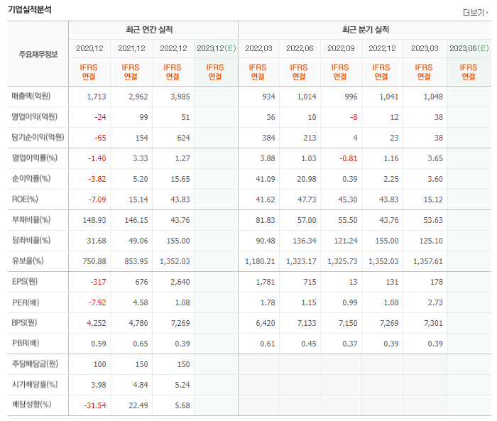 -2022년 12월 전년동기 대비 연결기준 매출액은 34.5% 증가, 영업이익은 48.6% 감소, 당기순이익은 295.9% 증가. 고객사 납품 및 가격 대응에 어려움을 겪음. 유형자산처분이익을 반영한 당기순이익은 268억 달성으로 경영실적이 크게 향상 되었음. 재고관리 효율화와 필드영업 활동 강화를 통한 동사 수요기반을 확대하여 철강산업 시황에 탄력적인 운영대응을 할 수 있도록 노력할 계획.