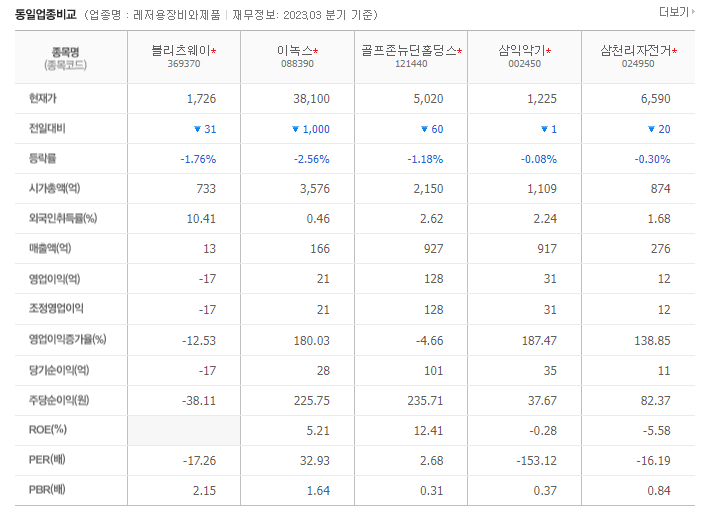 블리츠웨이 현재 주가는 1,757원이며 전일 대비 -29원의 모습을 보이고 있습니다. 블리츠웨이의 주주현황을 살펴보면 배성웅(외 4인)이 지분 52.73%를 소유하고 있습니다. 블리츠웨이는 레저용품 기업으로 장중 기준으로 주가는 1,757원 입니다. 삼성전자의 시가 총액은 732억 원이며 발행 주식수는 10.41주 입니다. 외국인 보유 비중은 57,534% 이며 장중 거래량은 42,492,942를 기록했습니다. 매출액은 13억 원, 영업이익은 -36억 원을 달성했습니다. EPS는 없음원이며 블리츠웨이 주식 배당수익률은 % 입니다.