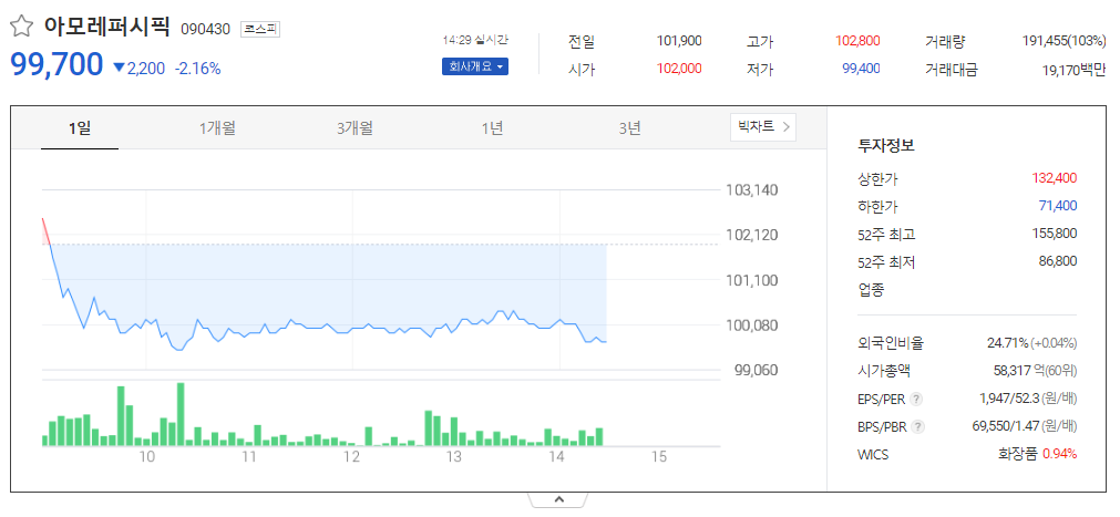 이 글에서는 아모레퍼시픽 주가 전망과 목표 주가, 기업 정보에 대해서 설명합니다. 주식을 제대로 하기에 앞서 기업 주가 정보와 재무 상태를 살펴보는 것은 굉장히 중요합니다. 아모레퍼시픽 주식의 주요 현황과 투자 정보를 확인하시고 현재 시장에서의 흐름을 파악해 보겠습니다.