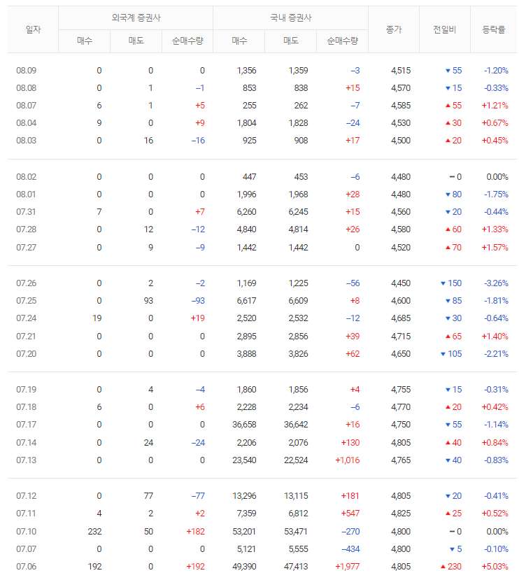 물론 가장 좋은 경우는 기관과 외국인 모두 매수하는 쌍끌이 주식을 투자하는 방법입니다. 양대 매수주체가 같이 매수한다는 뜻은 그만큼 좋은 종목인 것을 의미합니다. 주식의 흐름을 분석하기 위해서는 먼저 기업체를 분석하고 시장에서의 위치를 알아봐야 합니다. 그리고 기관이나 외국인 매수 흐름까지 살펴본다면 투자에 있어서 확률을 올릴 수 있다고 생각합니다.