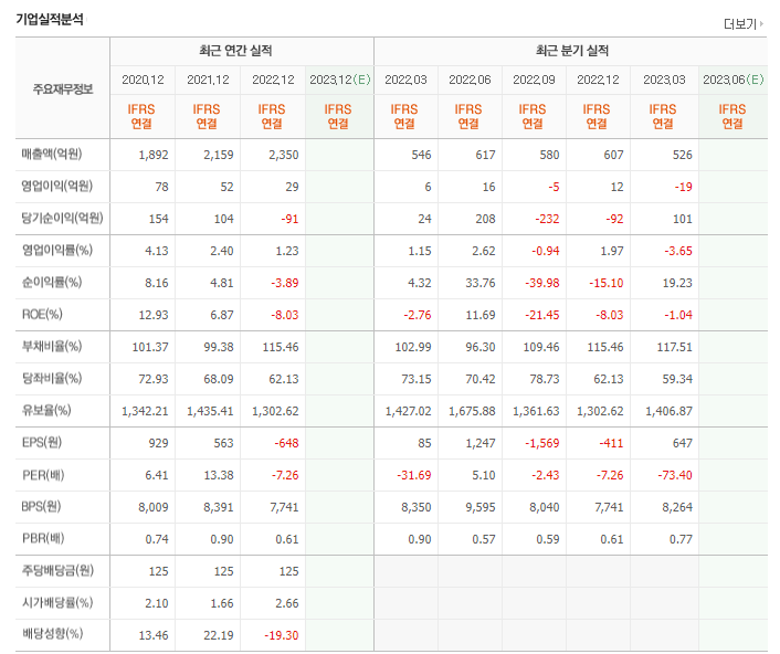 -2023년 3월 전년동기 대비 연결기준 매출액은 13.7% 감소, 영업이익 적자전환, 당기순이익 적자전환. 매출액이 전년 대비 감소하여 원가절감, 판관비 등의 비용 절감에도 영업이익이 대폭 감소하여 적자전환함. 휘스커 세라믹 절삭공구는 항공,발전부분에 중요한 부품이며 난삭재인 인코넬 등 Super alloy 절삭에 최적의 재질로 한국에서는 최초로 개발, 판매한 제품이며 전세계 난삭재 시장의 확대와 더불어 판매가 유망함.
