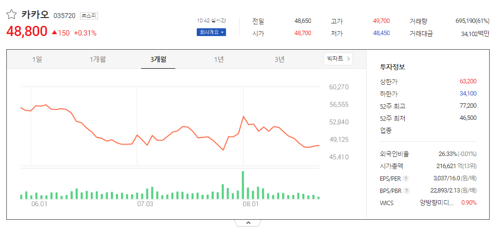 카카오 현재 주가는 48,650원이며 전일 대비 -3.85원의 모습을 보이고 있습니다. 카카오의 주주현황을 살펴보면 김범수(외 91인)이 지분 24.17%를 소유하고 있습니다. 카카오는 인터넷 서비스 기업으로 장중 기준으로 주가는 48,650원 입니다. 삼성전자의 시가 총액은 21조8621억 원이며 발행 주식수는 26.33주 입니다. 외국인 보유 비중은 1,131,155% 이며 장중 거래량은 444,351,090를 기록했습니다. 매출액은 37,828억 원, 영업이익은 5,803억 원을 달성했습니다. EPS는 840원이며 카카오 주식 배당수익률은 0.11% 입니다.