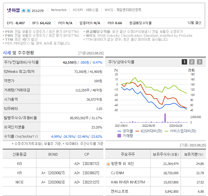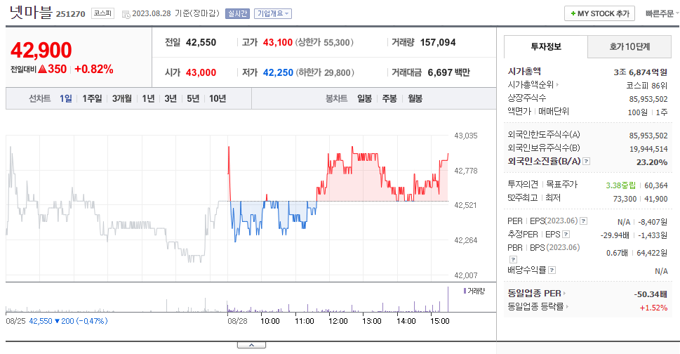 이 글에서는 넷마블 주가 전망과 목표 주가, 기업 정보에 대해서 설명합니다. 주식 거래에서 중요한 부분은 현재 기업 가치보다는 미래의 기업 가치를 예측하고 먼저 행동하는 것입니다. 투자할 종목을 고르기 전에 현재 기업의 상황과 지표를 살펴보는 것이 중요합니다. 넷마블 주식의 주요 현황과 투자 정보를 확인하시고 주식 투자에 유용한 정보들을 한 곳에 정리해두었으니 투자 전에 확인하시기 바랍니다..