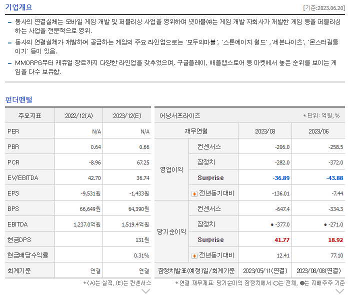 -2023년 3월 전년동기 대비 연결기준 매출액은 4.6% 감소, 영업손실은 135.9% 증가, 당기순손실은 12.4% 감소. 2분기 그랜드크로스W’, ‘신의 탑: 새로운 세계’ 등 다수의 신작 출시 할예정임. 동사는 모바일 게임 개발 회사와 시너지를 창출할 수 있는 다양한 회사를 발굴하고 인수하며 지속적으로 성장하고 있으며, 향후 게임사업과 접목 가능한 신기술 사업부문을 넓혀갈 계획임.