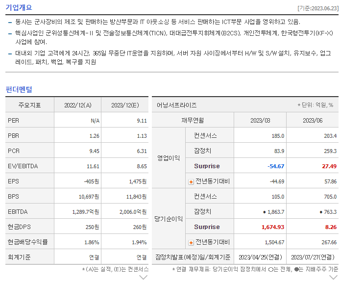 -동사는 군사장비의 제조 및 판매하는 방산부문과 IT 아웃소싱 등 서비스 판매하는 ICT부문 사업을 영위하고 있음. 핵심사업인 군위성통신체계-Ⅱ 및 전술정보통신체계(TICN), 대대급전투지휘체계(B2CS), 개인전투체계, 한국형전투기(KF-X) 사업에 참여. 대내외 기업 고객에게 24시간, 365일 무중단 IT운영을 지원하며, 서버 자원 사이징에서부터 H/W 및 S/W 설치, 유지보수, 업그레이드, 패치, 백업, 복구를 지원