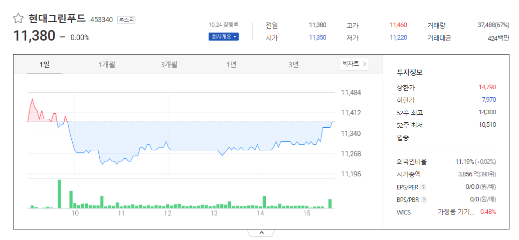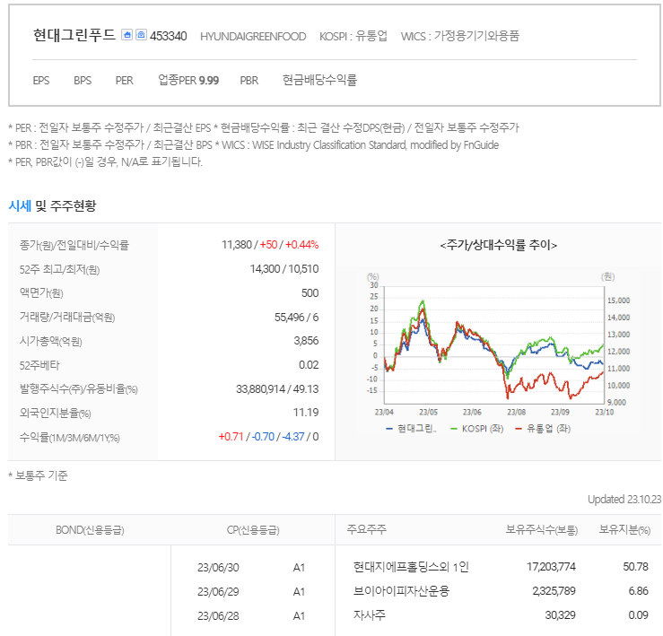 현대그린푸드 현재 주가는 11,380원이며 전일 대비 -0.70원의 모습을 보이고 있습니다. 현대그린푸드의 주주현황을 살펴보면 현대지에프홀딩스(외 1인)이 지분 50.78%를 소유하고 있습니다. 현대그린푸드는 복합 산업 기업으로 장중 기준으로 주가는 11,380원 입니다. 현대그린푸드의 시가 총액은 3835억 원이며 발행 주식수는 11.19주 입니다. 외국인 보유 비중은 55,496% 이며 장중 거래량은 33,880,914를 기록했습니다. 매출액은 6,950억 원, 영업이익은 억 원을 달성했습니다. EPS는 1,854원이며 현대그린푸드 주식 배당수익률은 3,856% 입니다.
