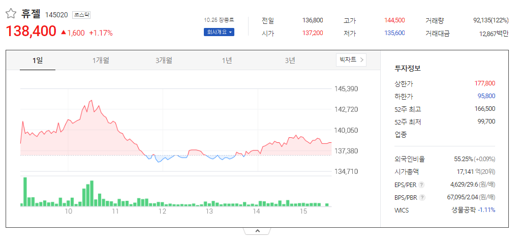 이 글에서는 휴젤 주가 전망과 목표 주가, 기업 정보에 대해서 설명합니다. 주식 투자의 중심은 미래의 기업 가치를 예측하고 선제적으로 움직이는 것입니다. 투자할 종목을 고르기 전에 현재 기업 상태와 지표를 살펴야 합니다. 휴젤 주식의 주요 현황과 투자 정보를 확인하시고 주식 투자에 유용한 자료들을 정리하여 제공하오니 효율적인 투자를 해보세요..