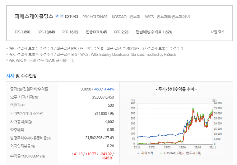 피에스케이홀딩스 현재 주가는 30,850원이며 전일 대비 -450원의 모습을 보이고 있습니다. 피에스케이홀딩스의 주주현황을 살펴보면 박경수(외 19인)이 지분 72.44%를 소유하고 있습니다. 피에스케이홀딩스는 반도체 및 관련장비 기업으로 장중 기준으로 주가는 30,850원 입니다. 피에스케이홀딩스 시가 총액은 7008억 원이며 발행 주식수는 0.26주 입니다. 외국인 보유 비중은 311,830% 이며 장중 거래량은 21,562,395를 기록했습니다. 매출액은 404억 원, 영업이익은 169억 원을 달성했습니다. 피에스케이홀딩스 주식 배당수익률은 8.00% 입니다.