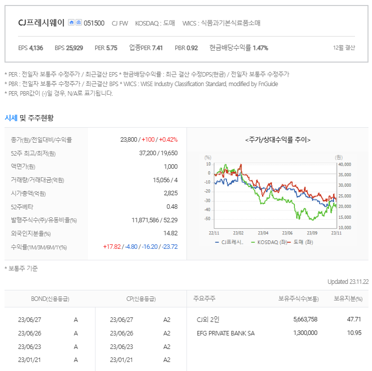 CJ프레시웨이 현재 주가는 23,800원이며 전일 대비 -4.80원의 모습을 보이고 있습니다. CJ프레시웨이의 주주현황을 살펴보면 CJ(외 2인)이 지분 47.71%를 소유하고 있습니다. CJ프레시웨이는 식료품 기업으로 장중 기준으로 주가는 23,800원 입니다. CJ프레시웨이 시가 총액은 2796억 원이며 발행 주식수는 14.82주 입니다. 외국인 보유 비중은 15,056% 이며 장중 거래량은 11,871,586를 기록했습니다. 매출액은 14,770억 원, 영업이익은 978억 원을 달성했습니다. EPS는 4,360원이며 CJ프레시웨이 주식 배당수익률은 1.09% 입니다.