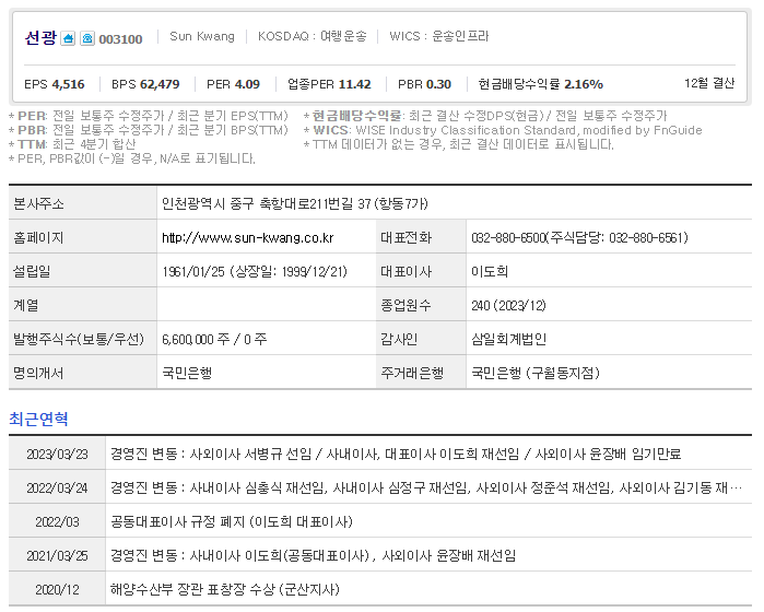 선광는 운송인프라 기업입니다. 대표자는 이도희 이며 설립일은 1961/01/25, 주식 상장일은 1999/12/21입니다. 전체 종업원 수는240명 이고 본사 주소는 인천시 중구 축항대로211번길 37입니다.