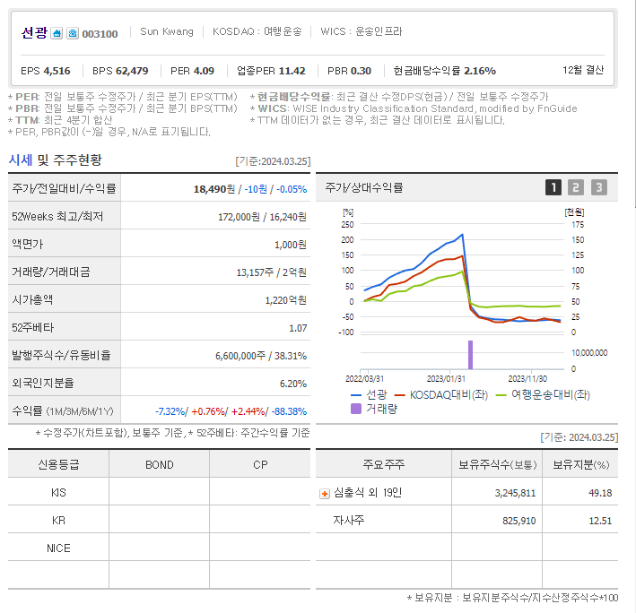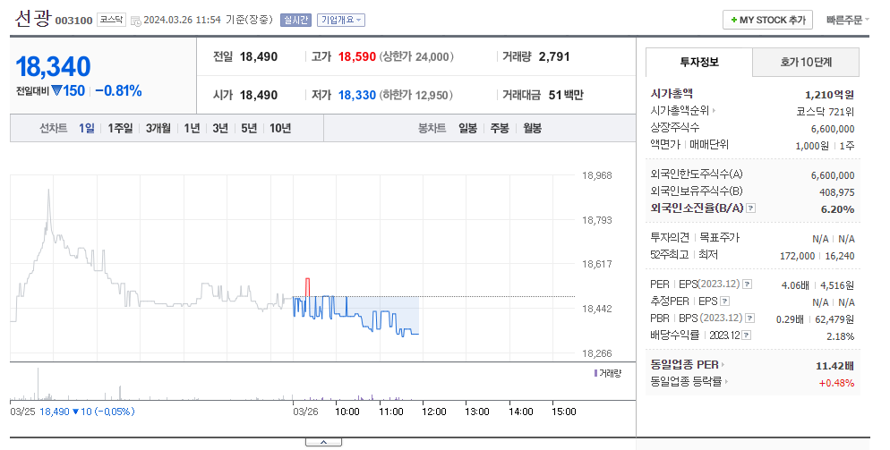 선광 현재 주가는 18,490원이며 전일 대비 -10원의 모습을 보이고 있습니다. 선광의 주주현황을 살펴보면 심충식 주주가 전체 지분 49.18%를 소유하고 있습니다. 선광는 운송인프라 기업으로 장중 기준으로 주가는 18,490원 입니다. 선광의 시가 총액은 1216억 원이며 발행 주식수는 6,600,000주 입니다. 외국인 보유 비중은 6.20% 이며 장중 거래량은 13,157원 을 기록했습니다. 매출액은 1,853억 원을 달성했습니다