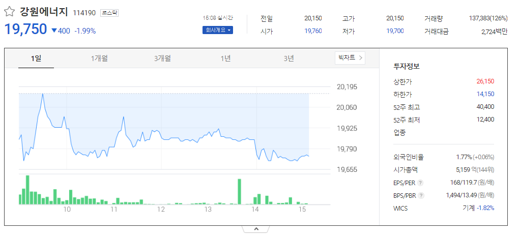 이 글에서는 강원에너지 주가 전망과 목표 주가, 기업 정보에 대해서 설명합니다. 주식 투자의 중심은 미래의 기업 가치를 예측하고 선제적으로 움직이는 것입니다. 투자할 종목을 고르기 전에 현재 기업 상태와 지표를 살펴야 합니다. 강원에너지 주식의 주요 현황과 투자 정보를 확인하시고 주식 투자에 도움이 되는 정보들을 모아 제공하니 투자에 도움을 받으실 수 있을 것입니다..