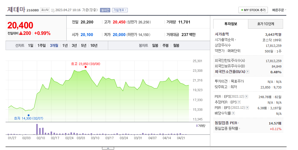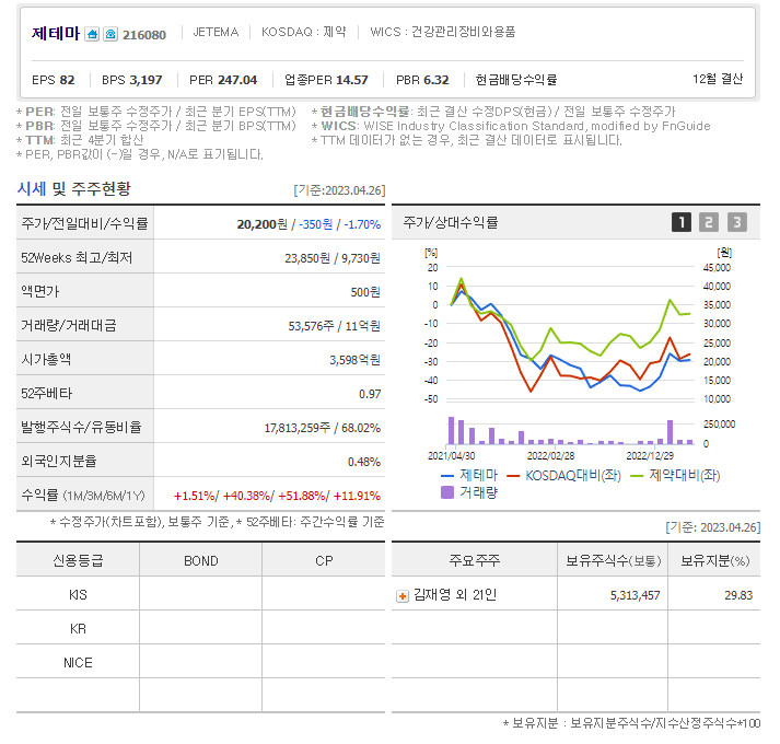 제테마 현재 주가는 20,400원이며 전일 대비 -200원의 모습을 보이고 있습니다. 제테마의 주주현황을 살펴보면 김재영(외 21인)이 지분 29.83%를 소유하고 있습니다. 제테마는 의료 장비 및 서비스 기업으로 장중 기준으로 주가는 20,200원 입니다. 삼성전자의 시가 총액은 3607억 원이며 발행 주식수는 0.48주 입니다. 외국인 보유 비중은 53,576% 이며 장중 거래량은 17,813,259를 기록했습니다. 매출액은 460억 원, 영업이익은 23억 원을 달성했습니다. EPS는 없음원이며 제테마 주식 배당수익률은 1.00% 입니다.