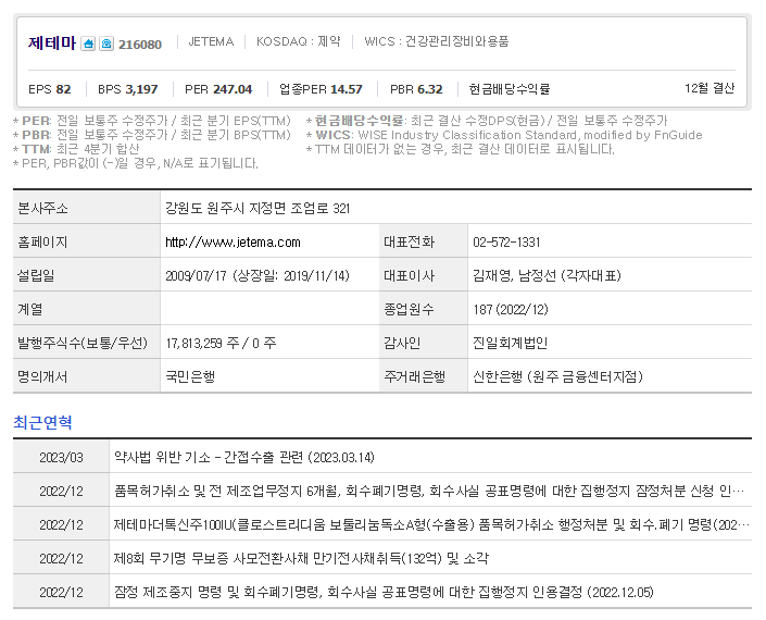 제테마는 의료 장비 및 서비스 기업입니다. 대표자는 김재영, 남정선 (각자대표) 이며 설립일은 2009/07/17, 주식 상장일은 2019/11/14입니다. 전체 종업원 수는187명 이고 본사 주소는 강원도 원주시 지정면 조엄로 321입니다.
