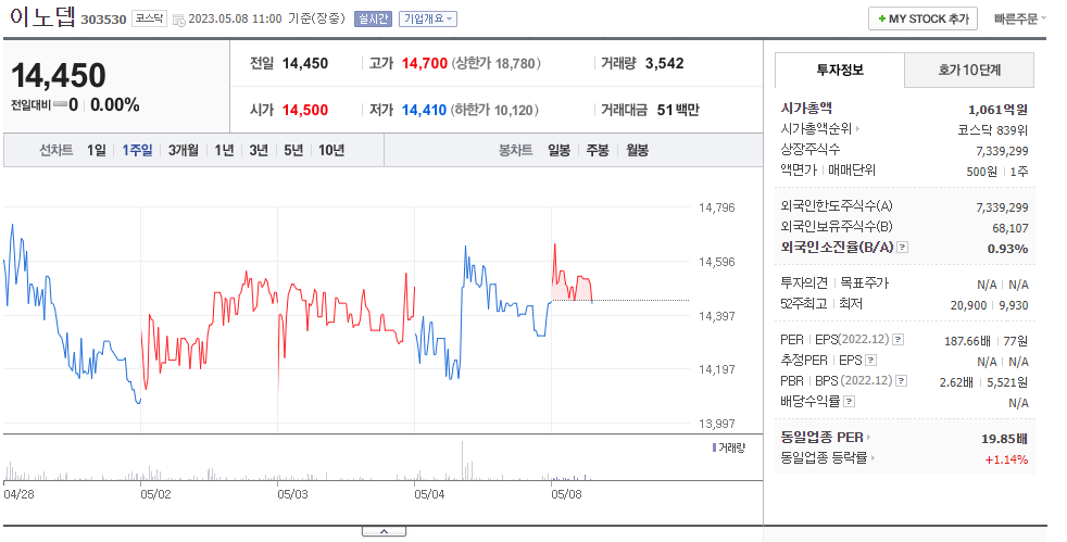 이노뎁 현재 주가는 14,450원이며 전일 대비 -80원의 모습을 보이고 있습니다. 이노뎁의 주주현황을 살펴보면 이성진(외 6인)이 지분 37.24%를 소유하고 있습니다. 이노뎁는 IT 서비스 기업으로 장중 기준으로 주가는 14,450원 입니다. 삼성전자의 시가 총액은 1061억 원이며 발행 주식수는 0.93주 입니다. 외국인 보유 비중은 23,231% 이며 장중 거래량은 7,339,299를 기록했습니다. 매출액은 764억 원, 영업이익은 -15억 원을 달성했습니다. EPS는 없음원이며 이노뎁 주식 배당수익률은 600% 입니다.