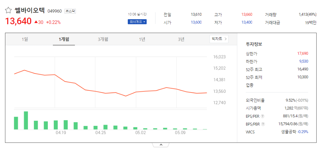 쎌바이오텍 주가 분석
