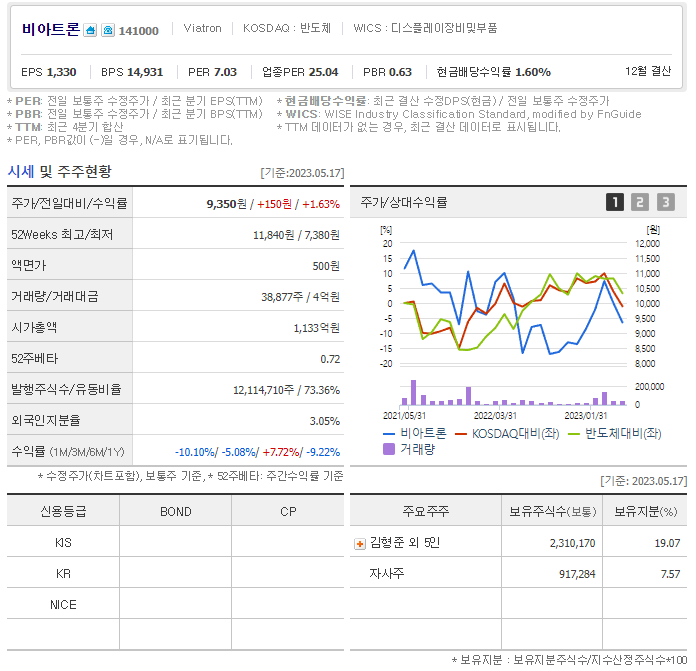 비아트론 현재 주가는 9,350원이며 전일 대비 -10.10원의 모습을 보이고 있습니다. 비아트론의 주주현황을 살펴보면 김형준(외 5인)이 지분 19.07%를 소유하고 있습니다. 비아트론는 디스플레이 및 관련부품 기업으로 장중 기준으로 주가는 9,350원 입니다. 삼성전자의 시가 총액은 1135억 원이며 발행 주식수는 3.05주 입니다. 외국인 보유 비중은 38,877% 이며 장중 거래량은 12,114,710를 기록했습니다. 매출액은 710억 원, 영업이익은 115억 원을 달성했습니다. EPS는 없음원이며 비아트론 주식 배당수익률은 238% 입니다.