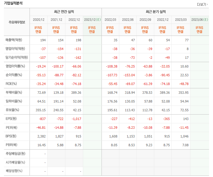 -2022년 12월 전년동기 대비 연결기준 매출액은 28.6% 증가, 영업손실은 15.2% 감소, 당기순손실은 40.9% 증가. 판관비 증가에도 불구하고 매출 확대와 원가율 하락에 힘입어 영업적자 폭이 축소됨. 코로나19로 인한 수술 감소로 매출이 감소하였으나 코로나19 상황 호전으로 지연되었던 수술 등이 증가할 것으로 예상되며 척추 임플란트 시장과 동사의 성장세도 회복될 것으로 전망.