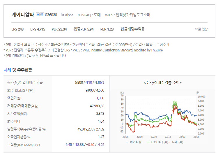 케이티알파 현재 주가는 5,800원이며 전일 대비 -110원의 모습을 보이고 있습니다. 케이티알파의 주주현황을 살펴보면 케이티(외 2인)이 지분 72.98%를 소유하고 있습니다. 케이티알파는 온라인쇼핑 기업으로 장중 기준으로 주가는 5,800원 입니다. 삼성전자의 시가 총액은 2853억 원이며 발행 주식수는 1.47주 입니다. 외국인 보유 비중은 47,980% 이며 장중 거래량은 49,019,283를 기록했습니다. 매출액은 1,074억 원, 영업이익은 152억 원을 달성했습니다. EPS는 없음원이며 케이티알파 주식 배당수익률은 % 입니다.